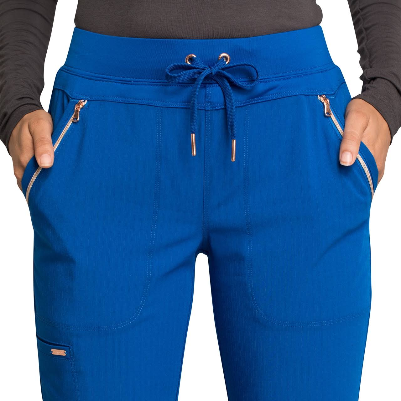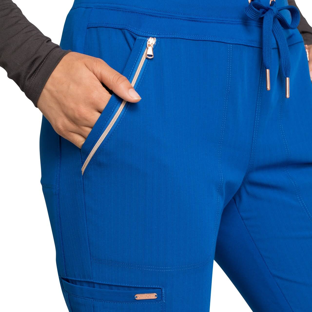 Pull-on styling, a figure-flattering cut, and a full back knit panel make this mid rise tapered leg pant a comfortable and elegant addition to your workwear repertoire. Additional design details include a drawstring front closure, front zip pockets, a cargo pocket at the wearer's right, and welt pockets at the back. Rose gold hardware adds a sophisticated accent to the style. Contemporary fit. Inseam: 33 inch This elegant linear dobby stretch fabric and comfort jersey knit is a chic combo great for a stylish medical professional that makes a STATEMENT!