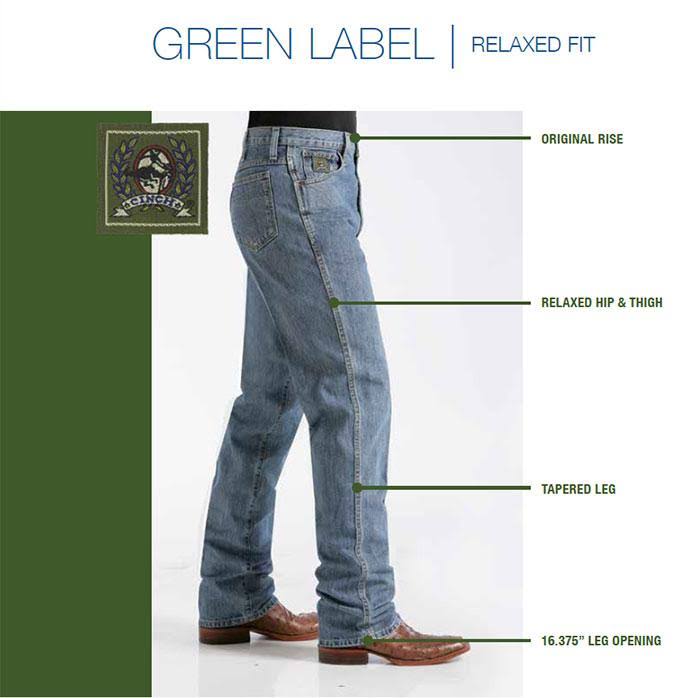 The first jean Cinch Jeans developed was the Green Label jean - the modern cowboy's jean staple. Jean features a clean fit with a little extra room in the thigh and knees. Five-pocket styling. Button waist and zipper fly. Made of 100% cotton denim, imported.