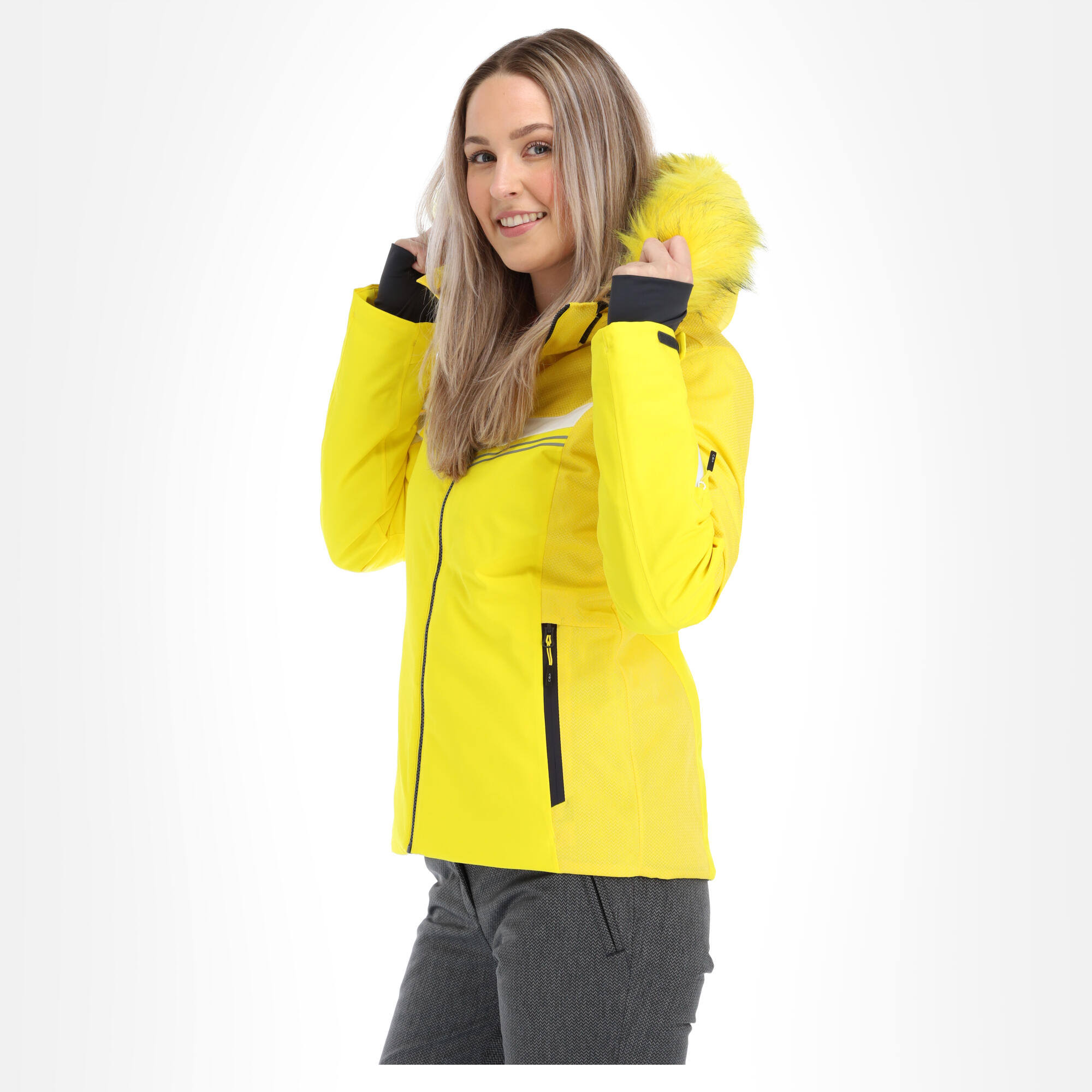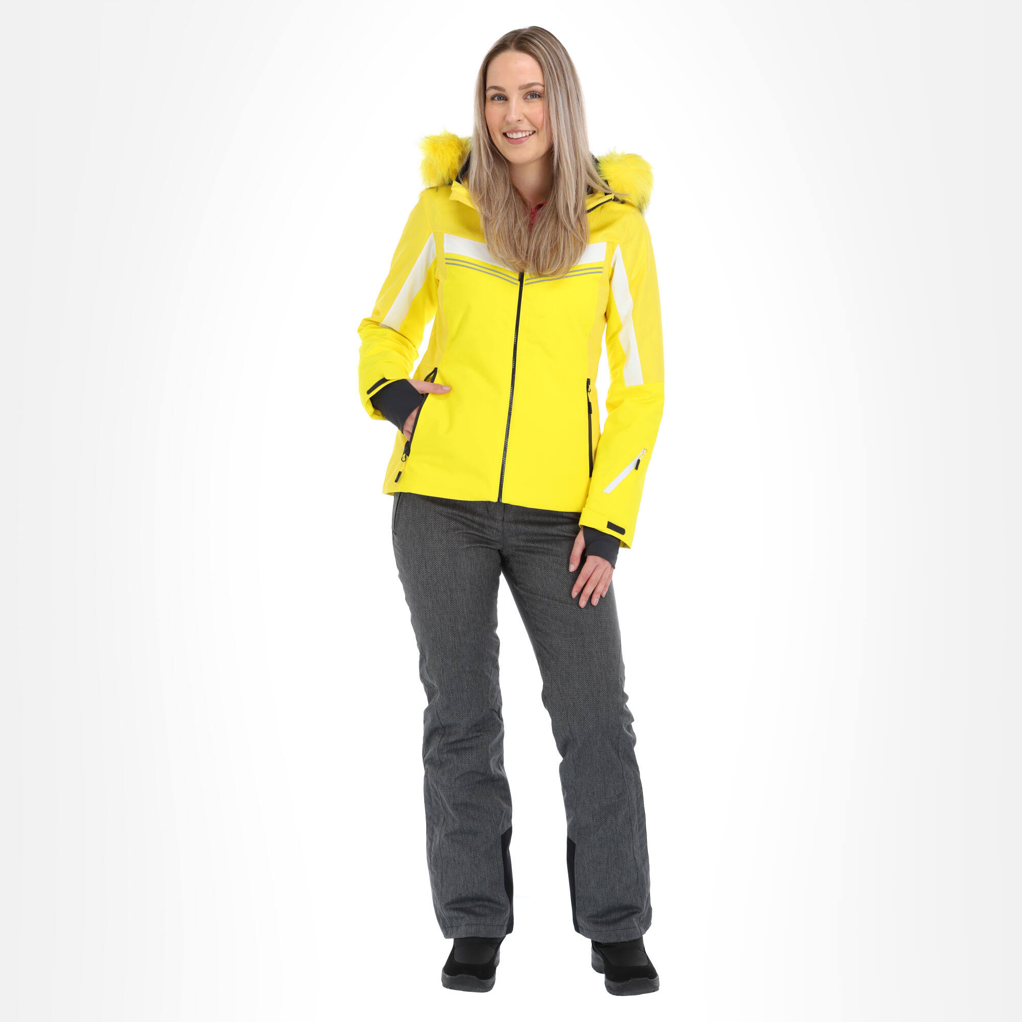 Weatherproof, insulated ski jacket with four-way stretch, synthetic fur trim, and great features