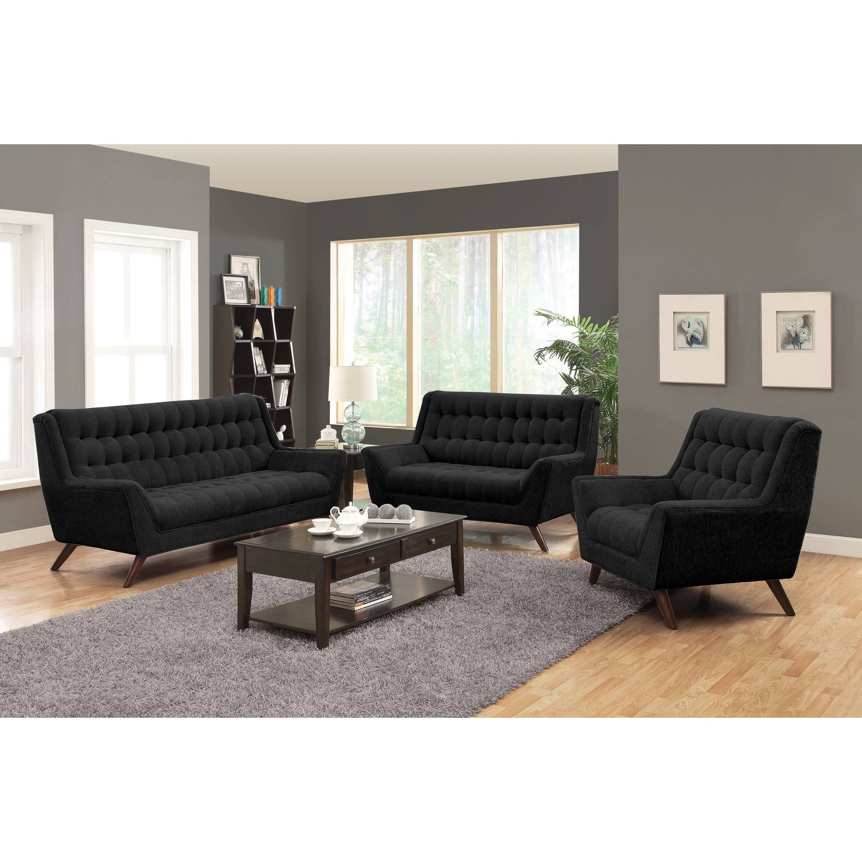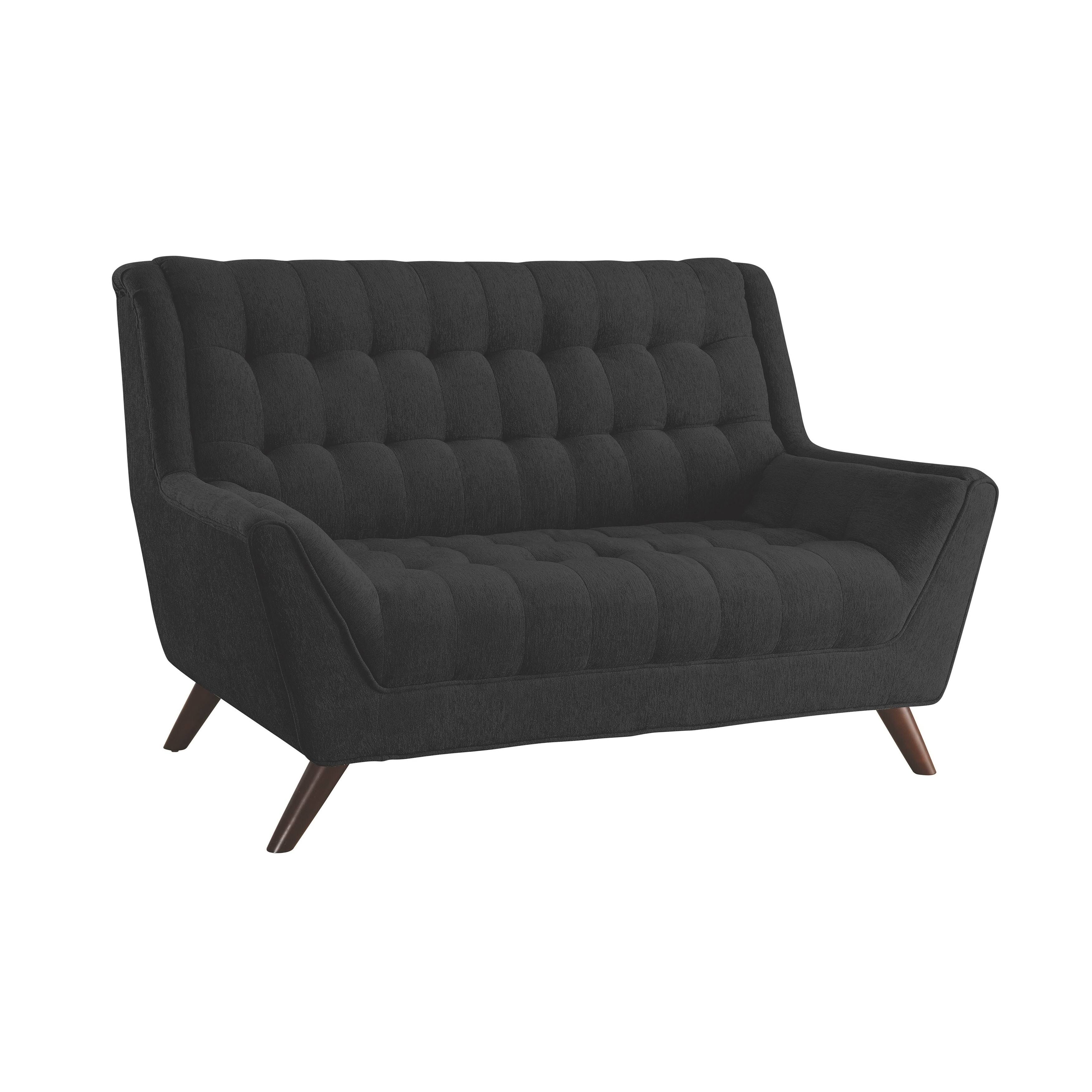 Bring the charm and simplicity of mid-century modern design into your living room with this black chenille loveseat. The loveseat is built to accommodate seating for two and features tufting on both its back and seats for a decorative and elegant touch. Enjoy comfortable pocket-coil seating along with padded arms. Four thin, angled wood legs finished in cappuccino add a final touch of style to the piece.