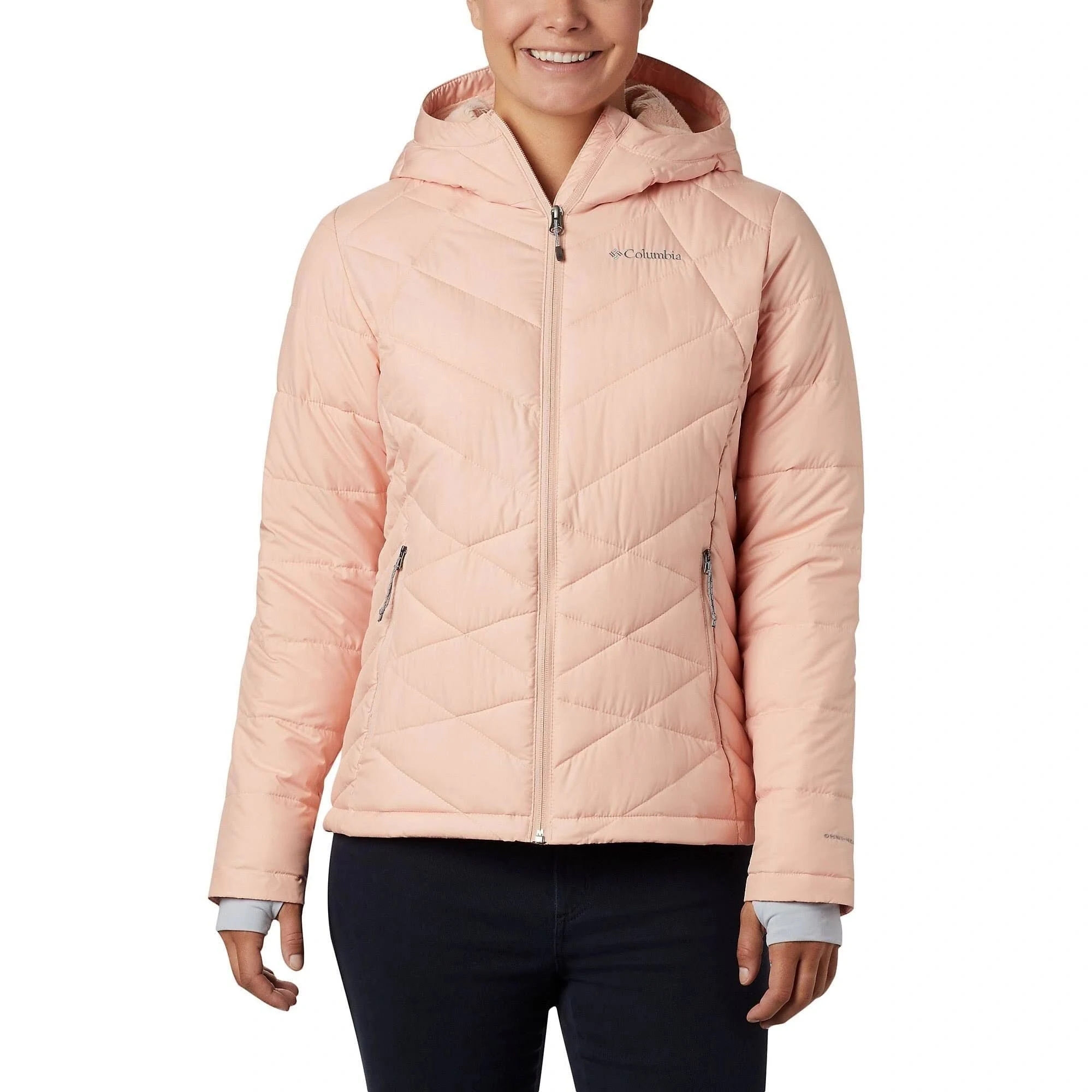 When you have to go out and face the cold, don the Columbia Heavenly Hooded Jacket for fierce protection from the elements. Synthetic down provides warmth while an Omni-Heat reflective lining further enhances the warmth of the jacket without adding extra bulk. To really keep things toasty, a fleece lined hood, drop tail, and thumbholes provide crucial coverage on especially chilly days. The casual aesthetic enhanced by the stitching pattern makes this jacket appropriate for any setting during the winter months.