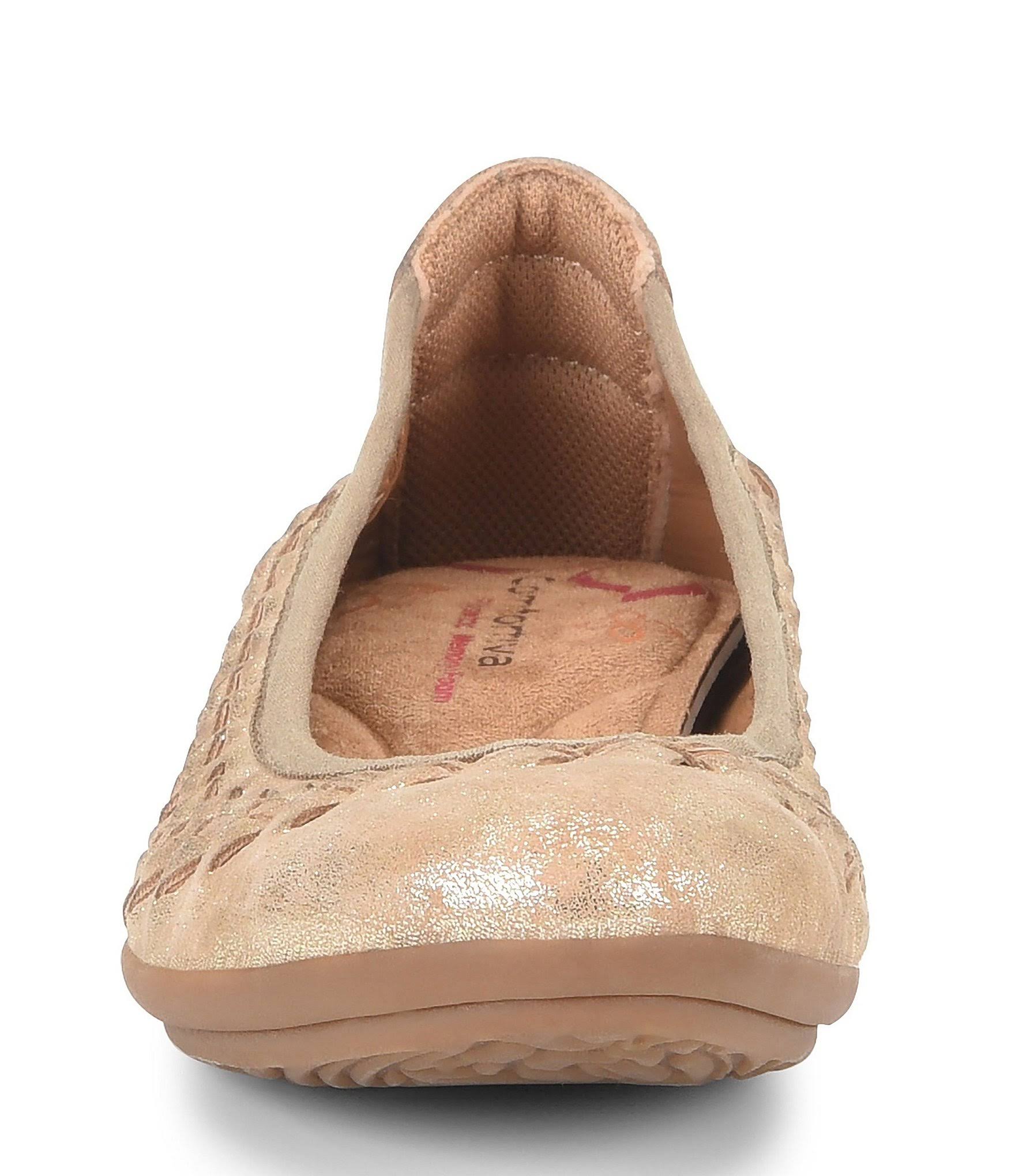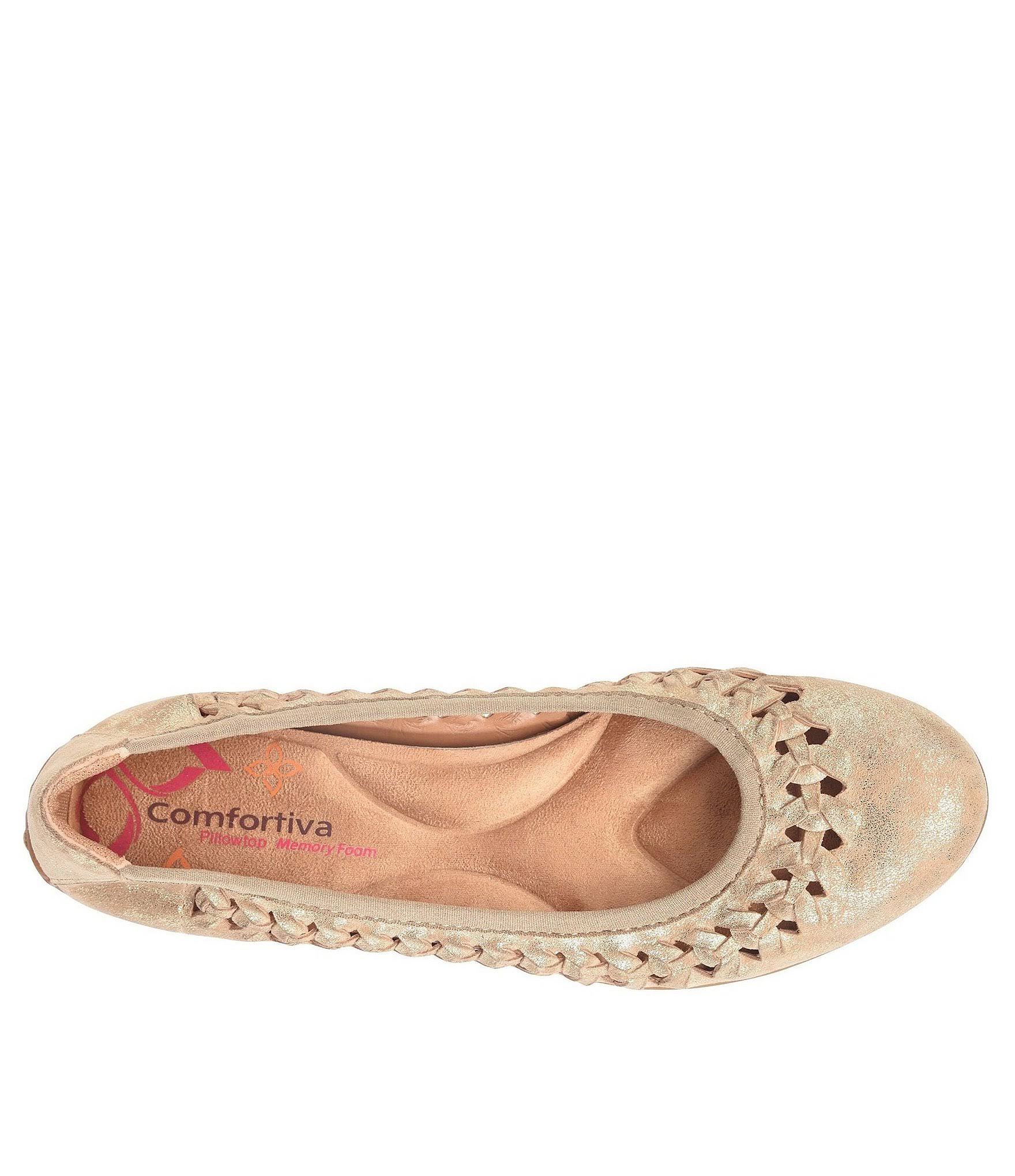 Pretty Braided Flats are Good for Your Feet Leather flats with pretty braided details from the toes to the heel make these striking ballet flats. Padded heel adds comfort while walking, and reduces friction that causes blisters. Pillowtop memory foam footbed adds exceptional cushioning. Added cushioned toe and heel help with energy return for comfort walking all day.