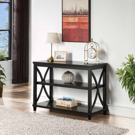 Modern farmhouse style. Middle and bottom shelf for displaying decor. Detailed double-edge top and bottom. Soft X-shaped side design. Thoughtfully developed and designed. Provides both stability and style. Quick and easy set up. Non-lead based paint. Made in Vietnam. Made from MDF and rubber wood. Assembly required. 42 in. W x 18 in. D x 30 in. H (51 lbs.). Typically found in category Console Tables.