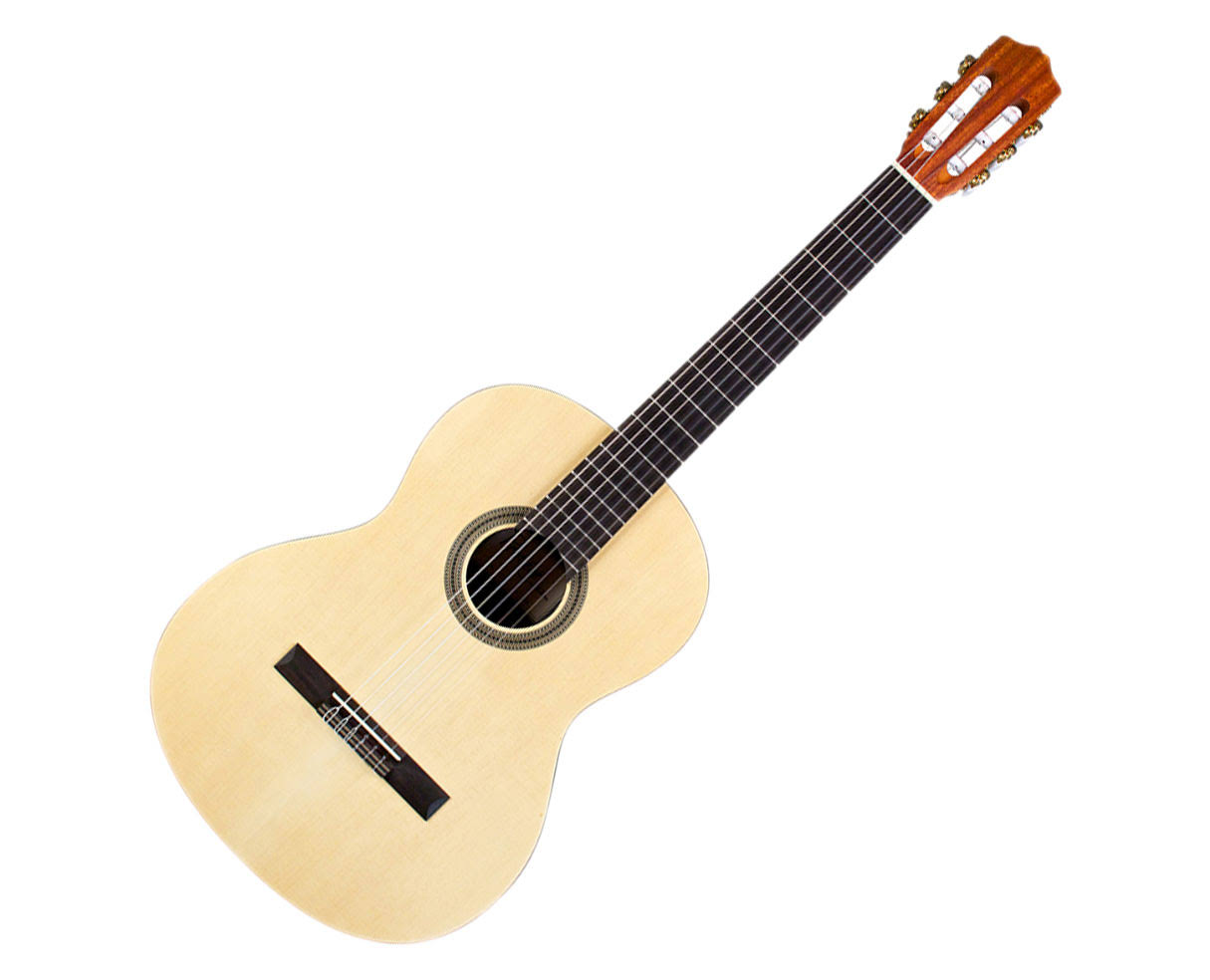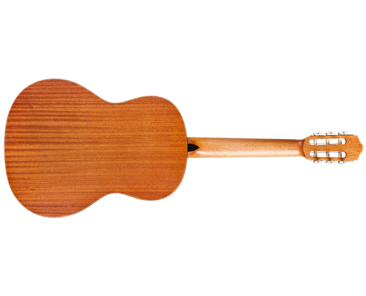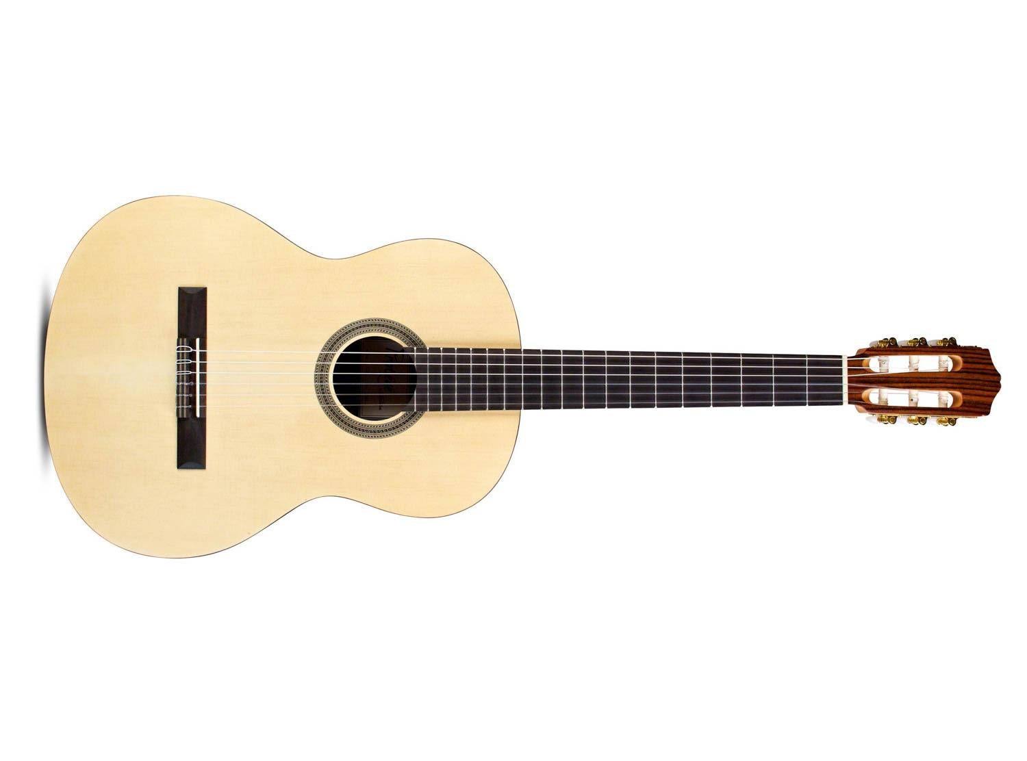 Designed for aspiring classical guitar players, the Protégé Series C1M from Cordoba is a full-size, nylon-string classical guitar with a natural, matte polyurethane finish. It utilizes a traditional, classical build with fan bracing, featuring a spruce top with mahogany back and sides. Aesthetics such as a traditional rosette and black ABS binding are also incorporated. The guitars mahogany neck sports a C-shaped profile, with a 25.6 scale and a rosewood fingerboard with 19 frets, joining the body at the 12th fret. At the headstock, a set of gold tuning machines with pearl buttons secure the strings while a rosewood bridge anchors the strings to the body. An adjustable dual-action truss rod is also included to help keep the neck straight.