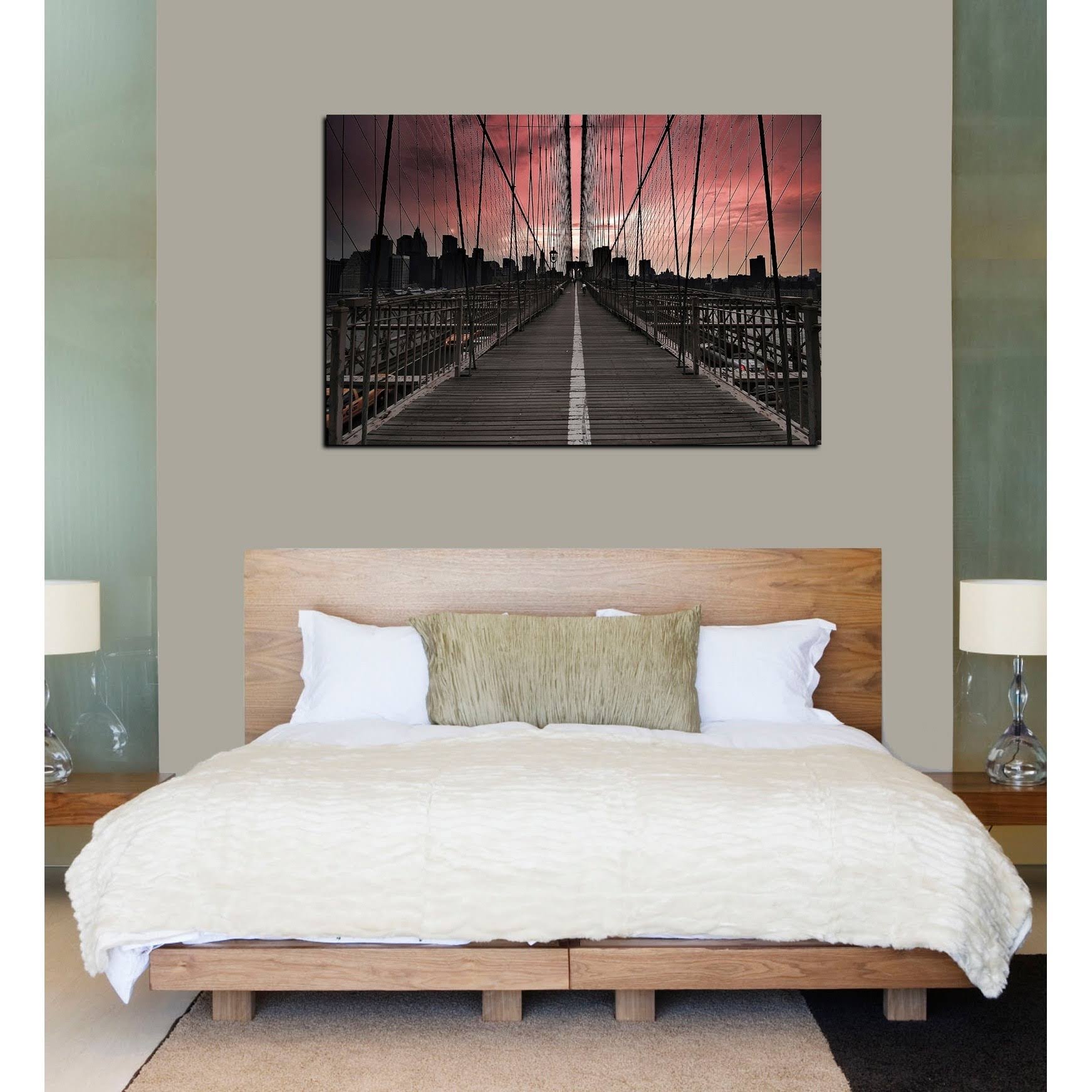 This tempered glass wall art brings a scenic Brooklyn Bridge view into the home or office. Imagine strolling along the iconic pedestrian walkway in this 24-inch by 36-inch piece. Horizontal orientation accentuates beautiful perspective Contemporary style brings a modern touch to any room Large-sized glass material creates a dramatic, classic effect Red and black color palette