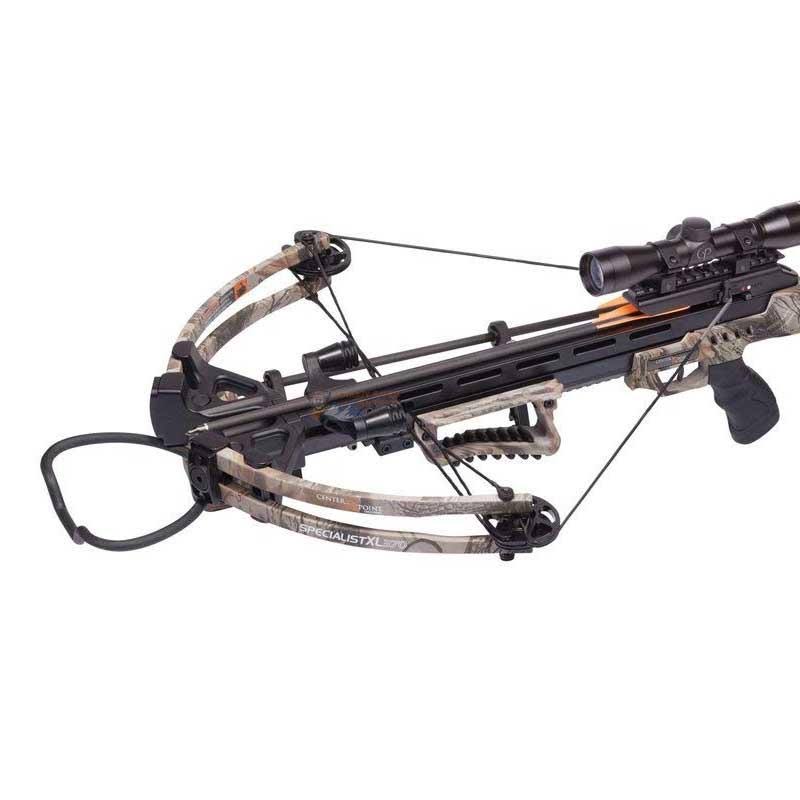 CenterPoint Spectre 375 Crossbow has an AR-Style butt stock with adjustable cheek piece, extendable butt pad and a pass-through fore grip with oversized finger guards. The Spectre has an all-weather camo synthetic stock, new styled side mount quiver bracket, durable aluminum shoot-through riser and noise suppressing string stoppers. The CenterPoint Spectre crossbow has a draw weight of 175 lbs and shoots up to 375fps. Anti-dry fire and auto-safety mechanism ensures nothing happens until you say so. This CenterPoint Crossbow Bundle includes everything an archer needs: three 20 370gr carbon bolts with field tips, quiver, rope cocker and 4x32mm crossbow scope.