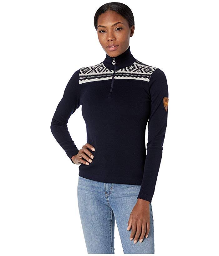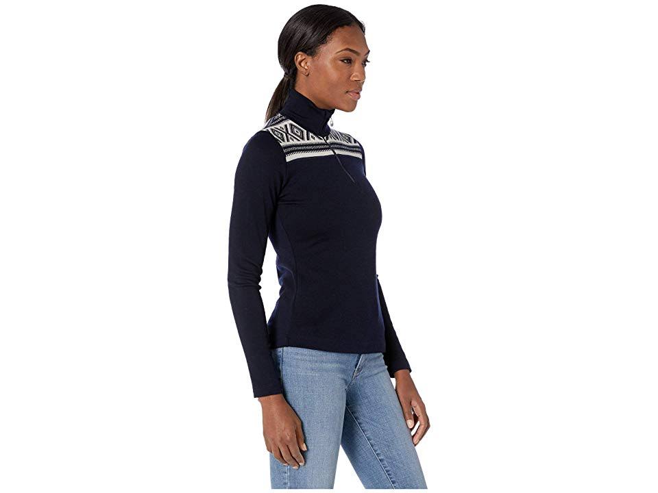Dale of Norway Cortina Basic Feminine Sweater C-Navy/Off-White MD (Women's 8-10) - This Dale of Norway Cortina Basic Feminine Sweater is super soft and makes for a perfect base layer so you can hit the hill in comfort this season! Stand collar provides additional warmth when you need it. Quarter zip closure with branded zipper pull lets you vent excess heat. Long sleeves taper to fitted cuffs. Geometric knit design on the shoulders. Brand patch on the left sleeve. 100% Merino wool. Machine wash, dry flat. Imported. Measurements: Length: 27 in Product measurements were taken using size SM (Women's 4-6).