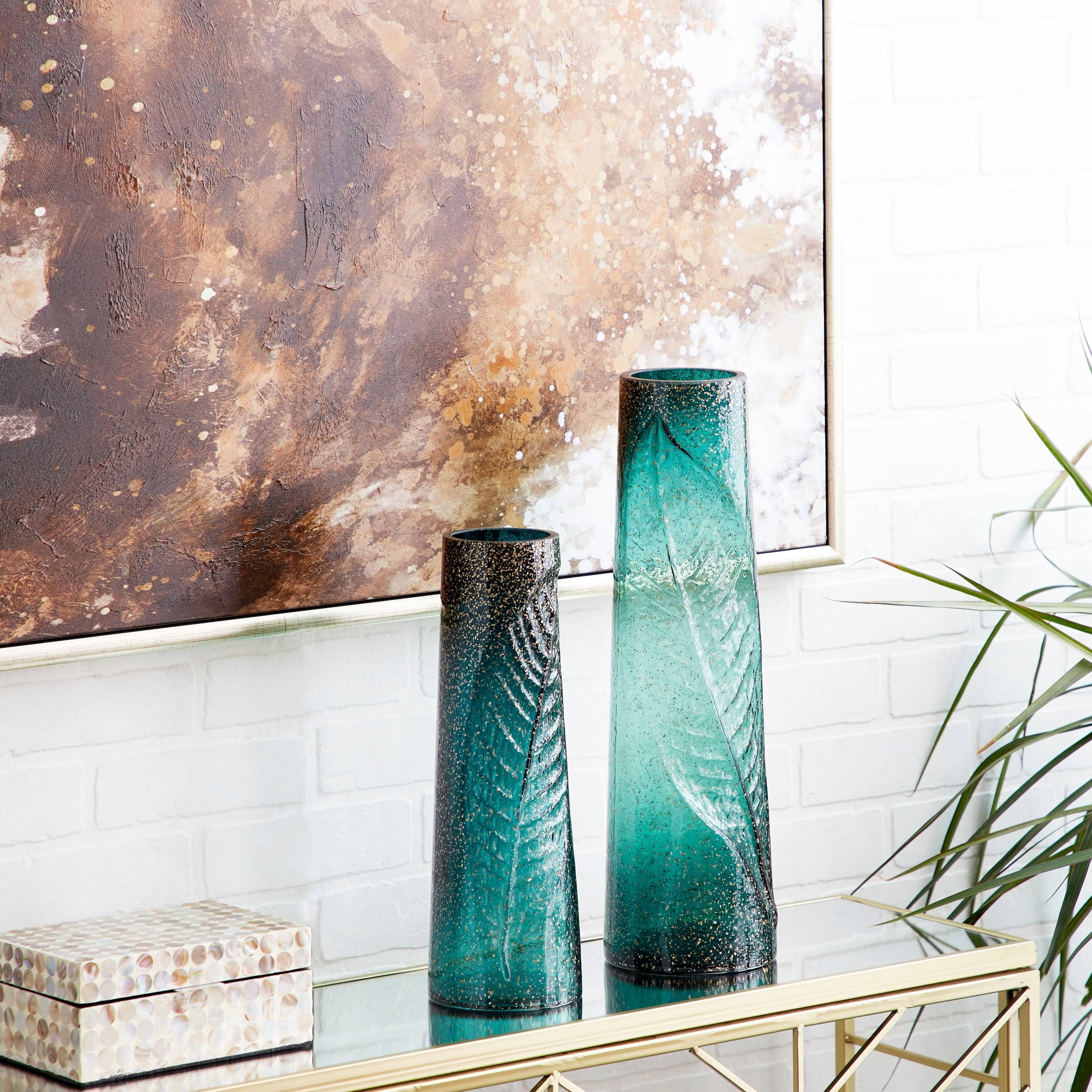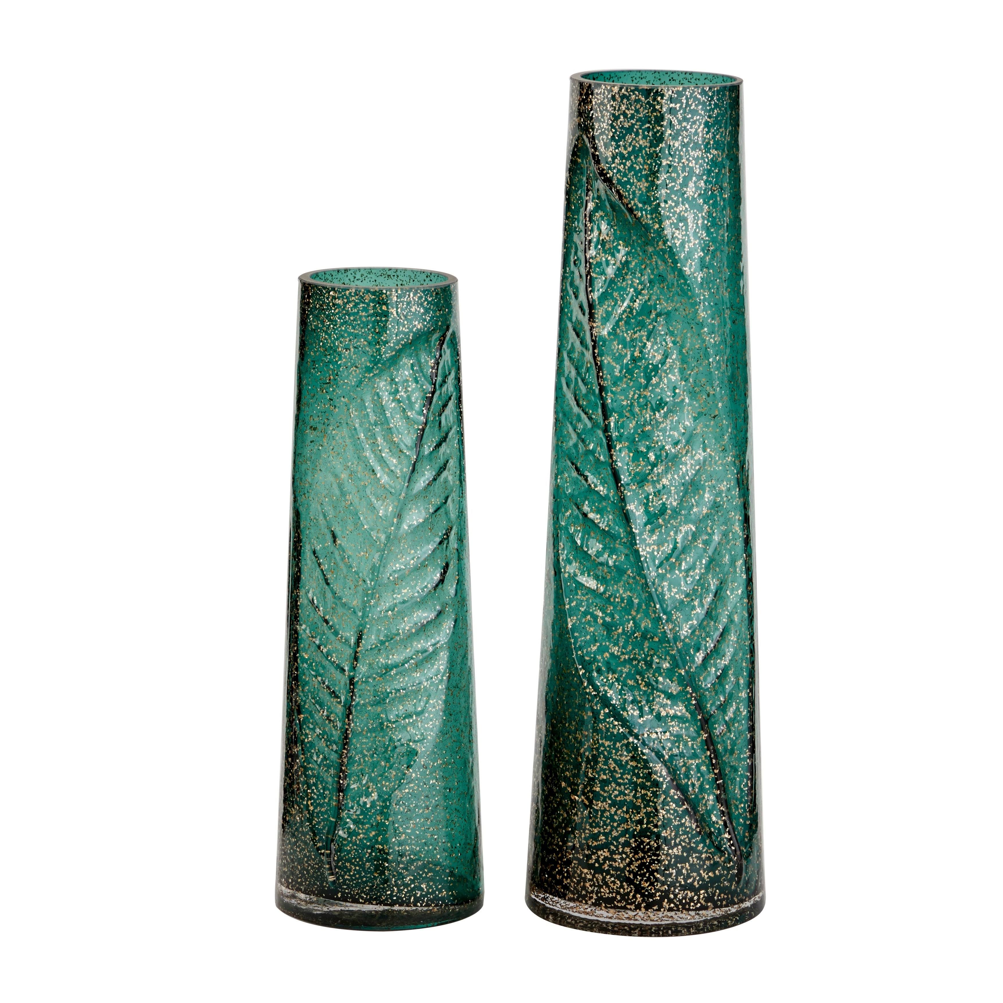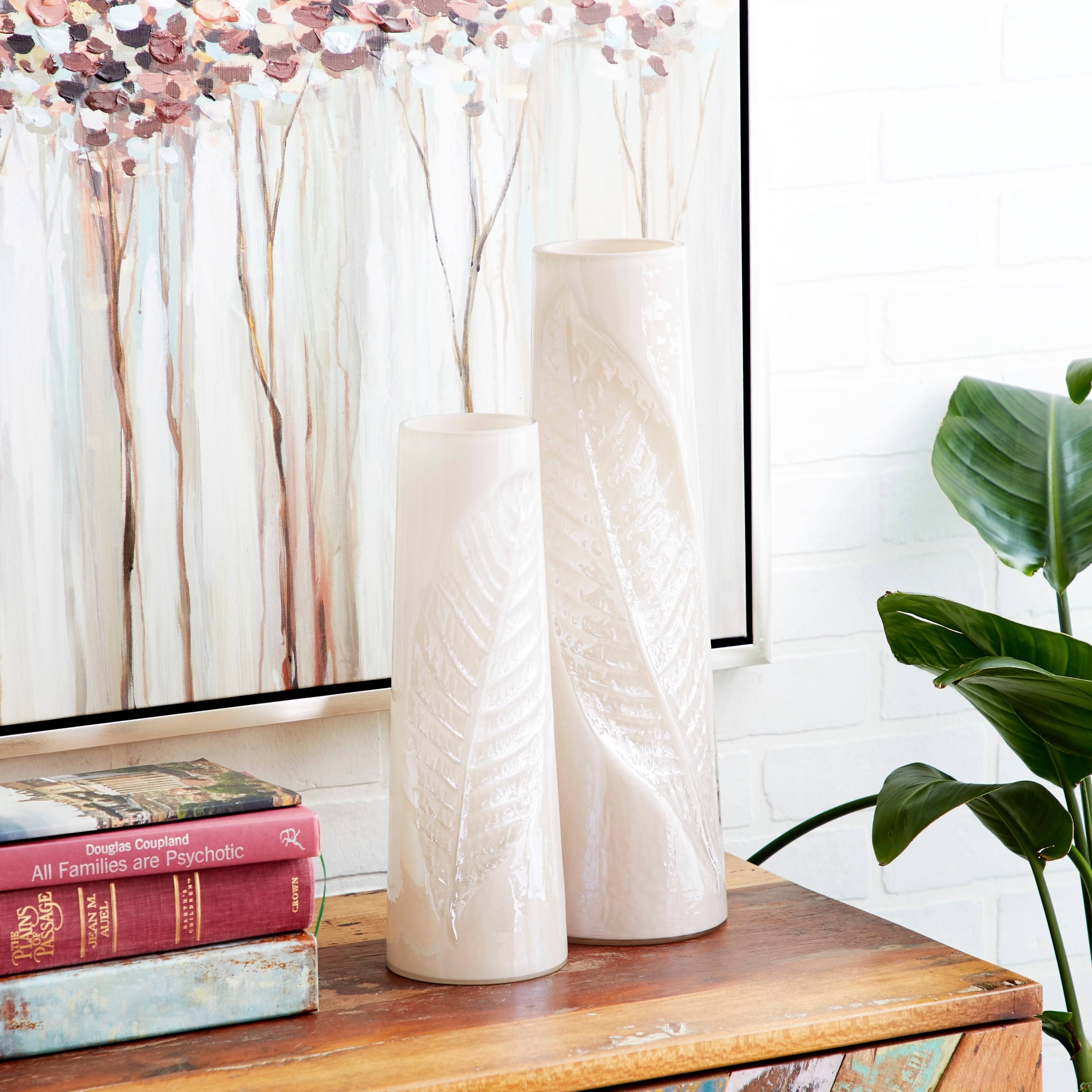 Decmode Large Cylinder Pearl White Glass Vases with Leaf Imprints, Set of 2: 14.5 inch, 18.5 inch PE1T_MRT519