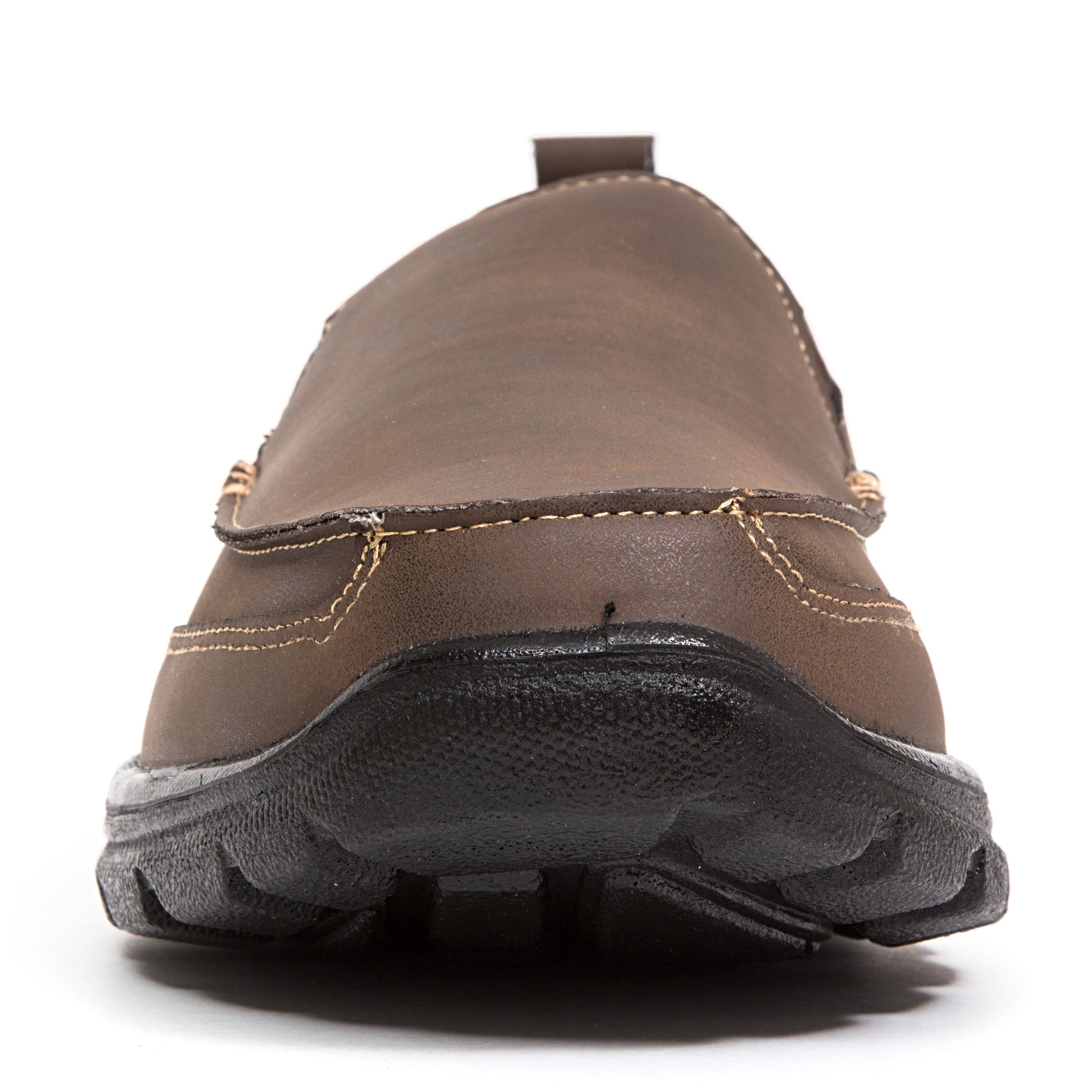 Stylish, simulated leather uppers, cushioned sock with memory foam for all-day comfort; foam midsole helps absorb shock; manmade synthetic sole provides excellent traction, mesh lining wicks away moisture, elasticized twin gores provide a comfortable fit and the rear pull-on loop makes for an easy on/off. Imported. In brown, size 13W by Deer Stags.