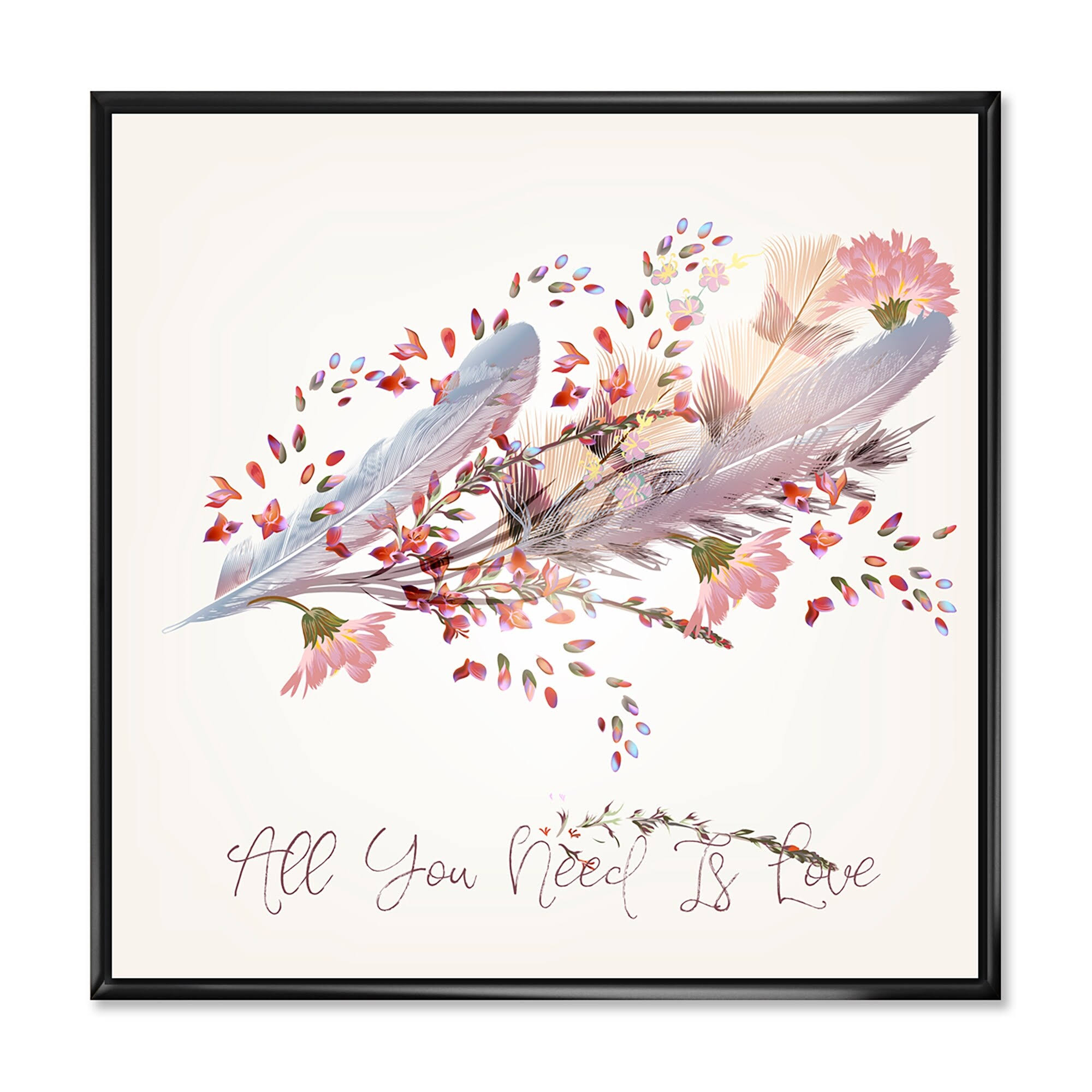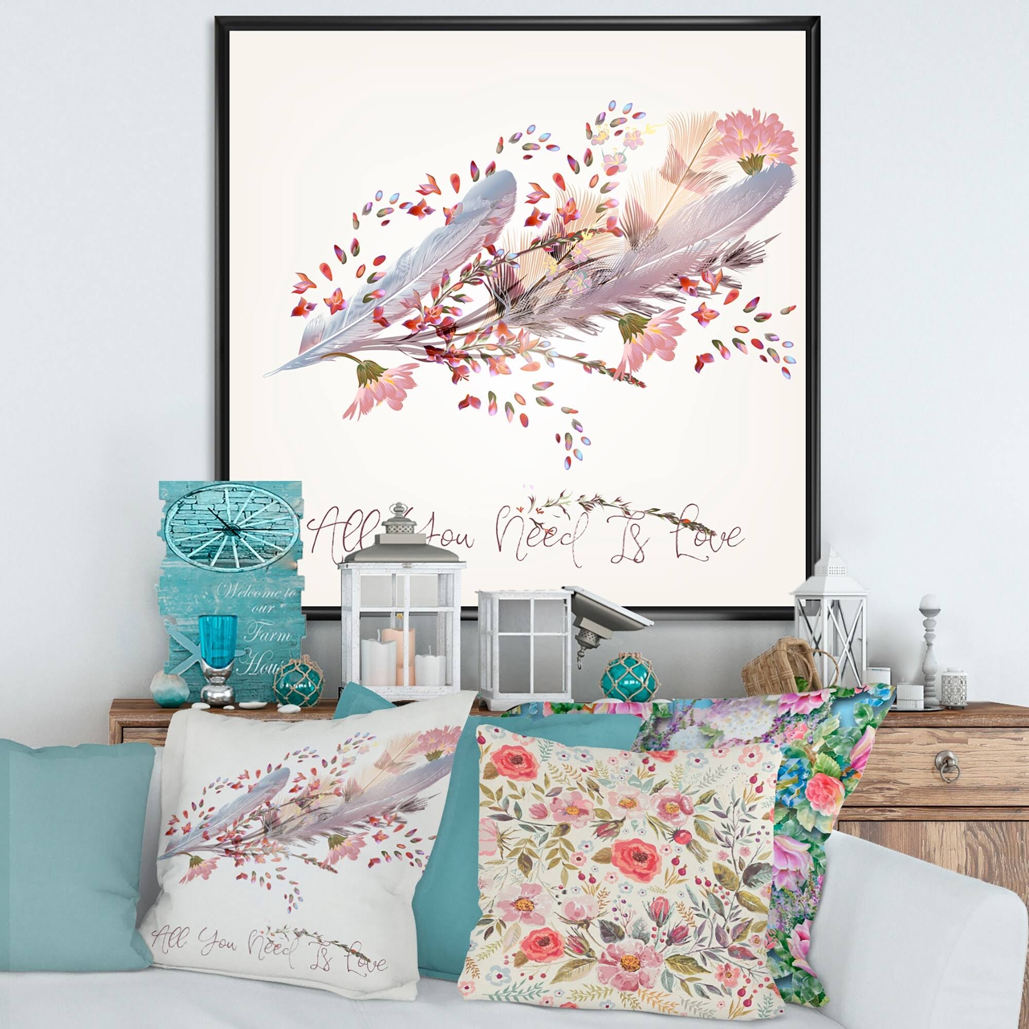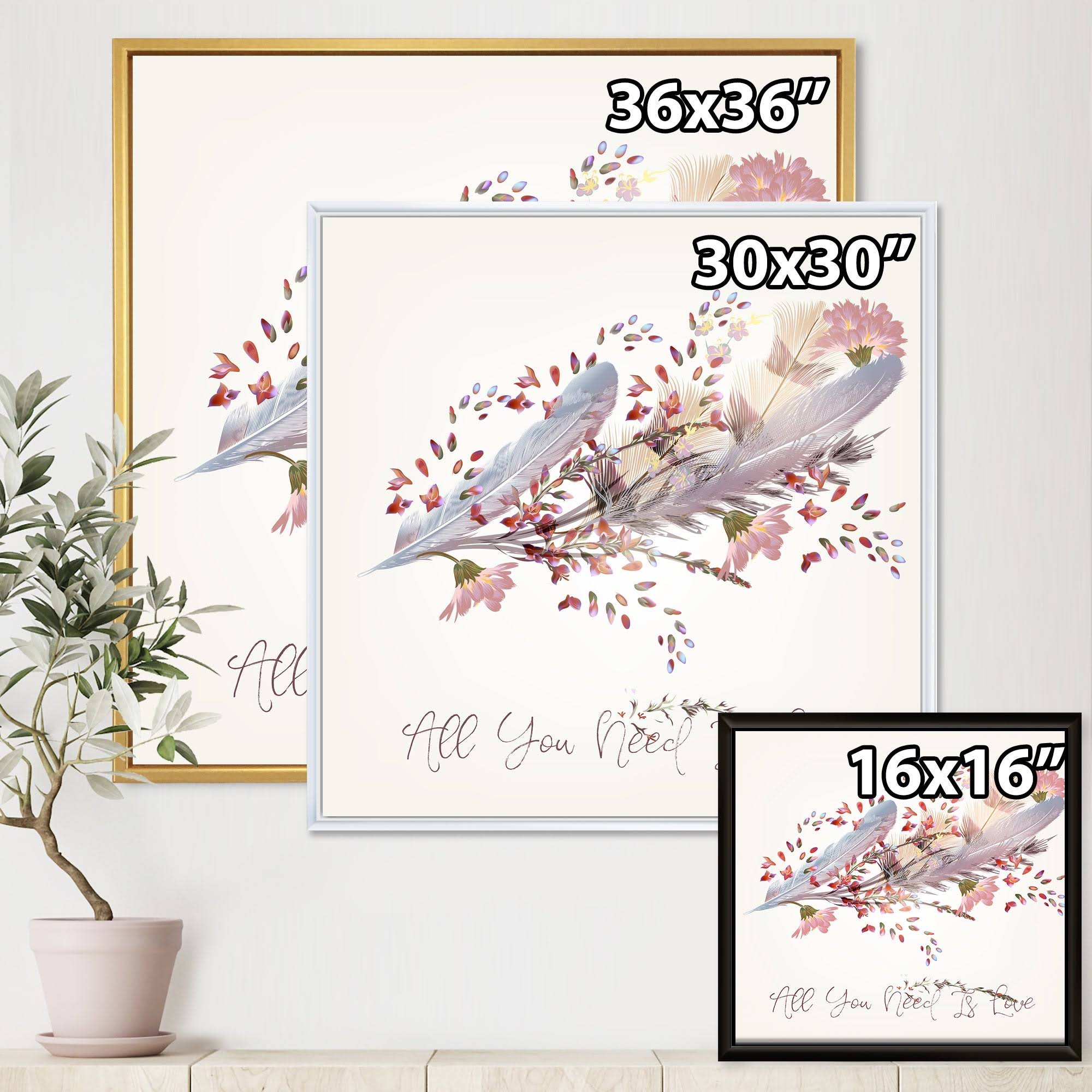 Designart &Pink Feathers and Bird All You Need Is Love& Bohemian Eclectic Framed Canvas Wall Art Print - 36 in. Wide x 36 LH5C_YHV117