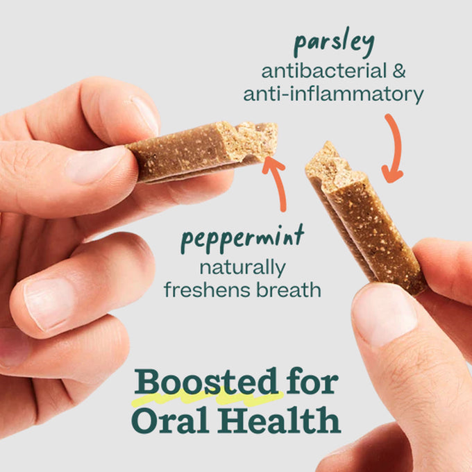 Fresh refills for cleaner, happier smiles! Keep your pup’s smile shining with the Woof Bite N’ Brush Refill 18 Pack! Each refill pack includes fresh, small-batch dog dental chews made in the USA with all-natural, vet-approved ingredients that help reduce plaque and tartar while promoting fresh breath and healthy gums. Designed to fit perfectly with your Woof Bite N’ Brush dog toothbrush toy, these tasty refills make brushing time easy, fun and rewarding for your furry friend.